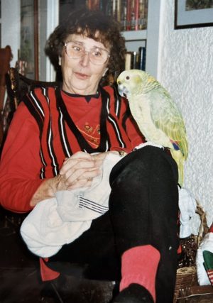 She loved animals as much as her own children and grandchildren–especially her 26-year-old parrot, Bismarck, who ate every meal with my parents until the bird passed in 2013. Her affection for dogs and cats only seemed to grow as dementia took hold, and we always took our dog Cacteye to visit her at the Forum senior care facility where she spent the final months of her life.